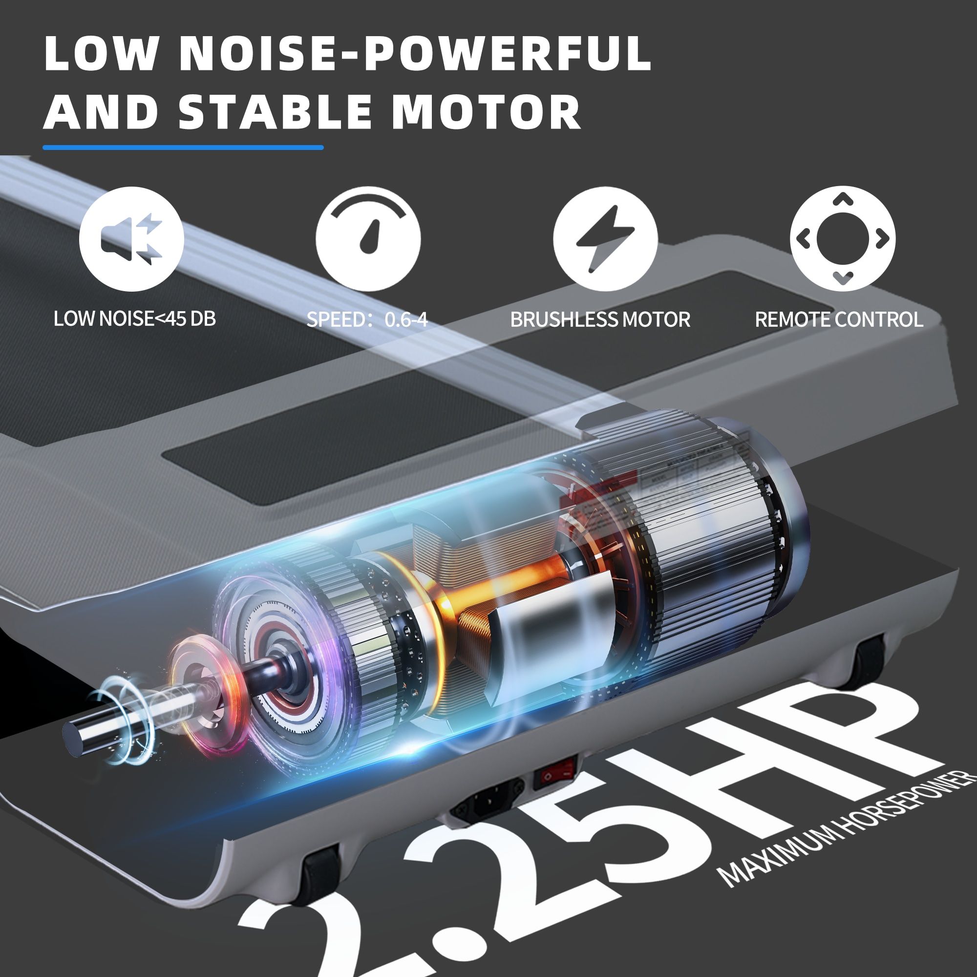 Powerful and Efficient Brushless MotorThis treadmill features a brushless motor with a peak power of 2.25hp and a continuous power of 0.85hp, providing strong and stable performance. The brushless design not only enhances motor efficiency but also reduces operating noise and maintenance needs. Experience smooth running with consistent performance, whether you're engaging in high-intensity workouts or gentle walking, ensuring reliable support for every exercise session.